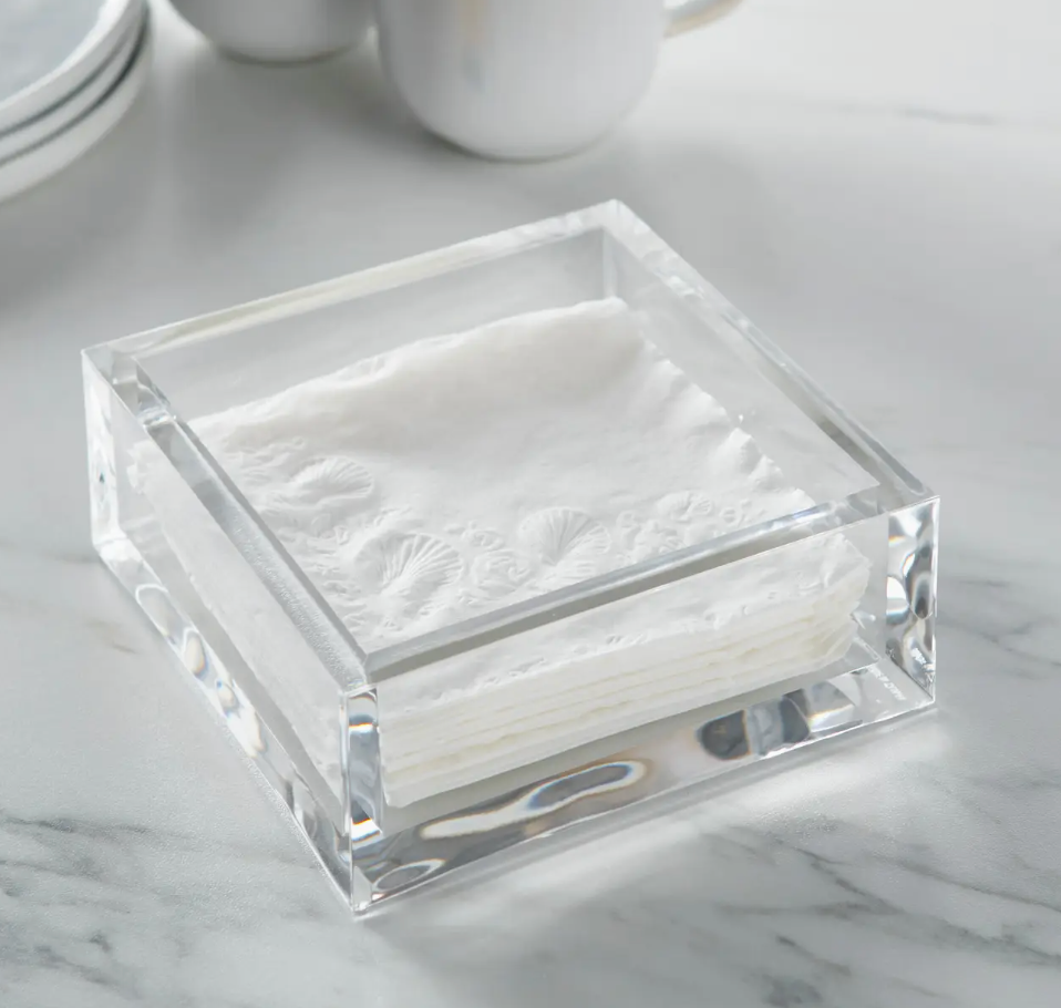 The Acrylic Clear Deluxe Cocktail Napkin Holder Tray is the perfect tray for 5" x 5" cocktail napkins. Its classy, square and durable construction make it a great choice for the kitchen or dining room. Its extra thick construction gives it a luxurious feel and appearance.