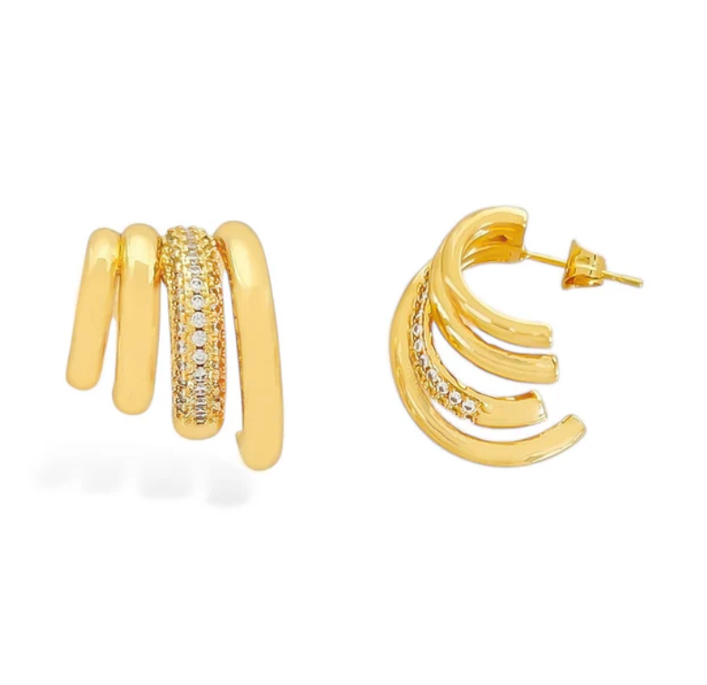 The Astra Hoop brings radiant dimension to your look with its layered silhouette and sparkling CZ detailing. Three gleaming gold bands intertwine gracefully, with a center row of cubic zirconia that captures the light from every angle. Mirrored for perfect symmetry, these earrings elevate any outfit with a balance of modern edge and timeless allure.