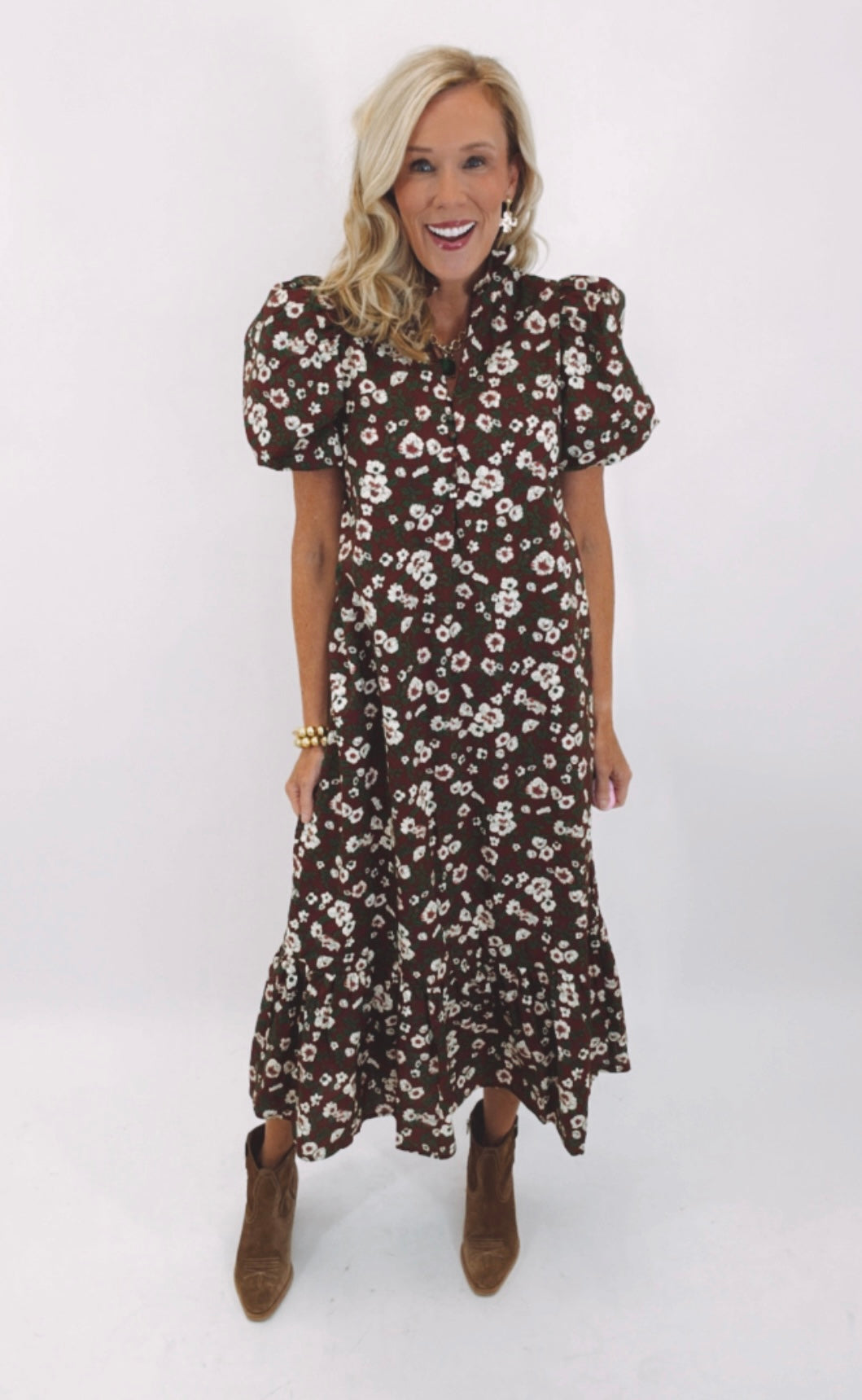The Autumn Bloom Midi is fall florals done right. With puff sleeves, a button-front neckline, and a ruffled tiered hem, this dress blends cozy charm with feminine elegance. The rich floral print makes it an easy statement piece for crisp fall days, while the relaxed silhouette keeps it comfortable and versatile.