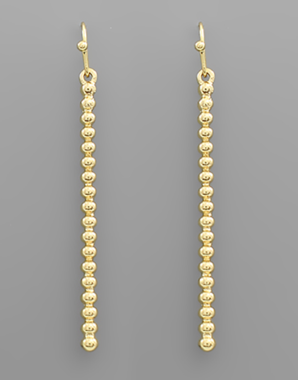 Sleek, simple, and seriously chic. These 2.5" long drop earrings feature a polished string of gold beads that catch the light just right. A minimalist statement that still knows how to turn heads.