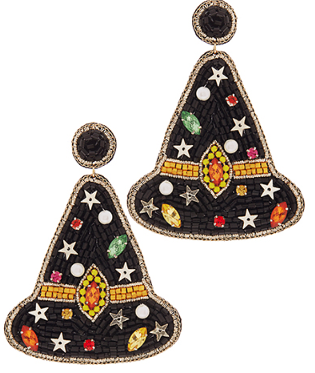 The Bewitched Bauble Earrings are a spellbinding statement piece, designed in the shape of a jeweled witch hat. At 3" long, these earrings feature intricate beaded details, sparkling gem accents, and star embellishments that shimmer with every movement. Bold, playful, and oh-so-festive, they’re the ultimate accessory for Halloween magic.