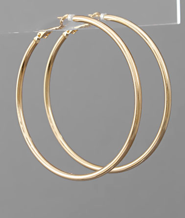 Sleek, lightweight, and effortlessly chic, the Bigger Than Basic Hoop is your go-to statement without the weight. Designed with a larger diameter and a slim gold-tone profile, these hoops deliver that bold look while staying easy and comfortable to wear all day.