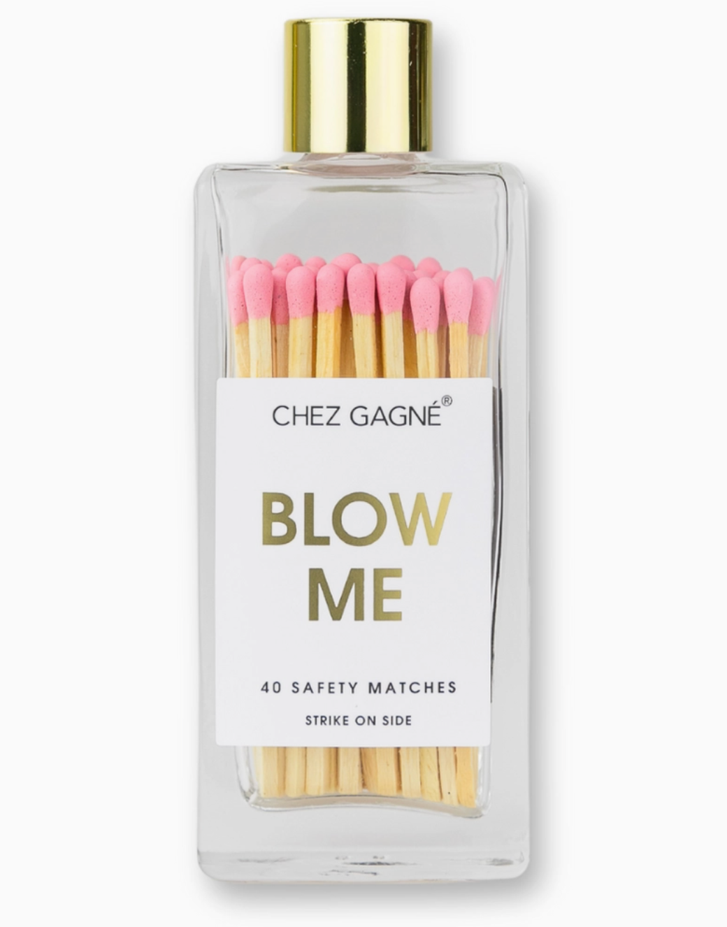 Phrase: Blow Me Glass Bottle with gold lid 40qty Safety Matches Pink Tipped Striker on Side of Bottle for easy strike and light 1.84 x 4.75, 1.8oz Glass Bottle