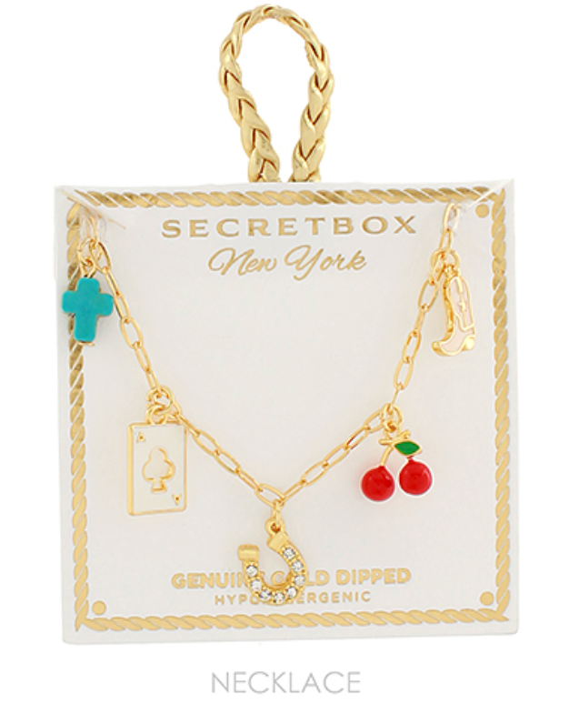 Add a little country kick to your jewelry lineup with the Boot Scootin’ Charm Necklace. This 16" gold-dipped chain is packed with personality—featuring a cowboy boot, turquoise cross, sparkly horseshoe, cherries, and a lucky spade charm. It's playful, polished, and just the right amount of yeehaw.