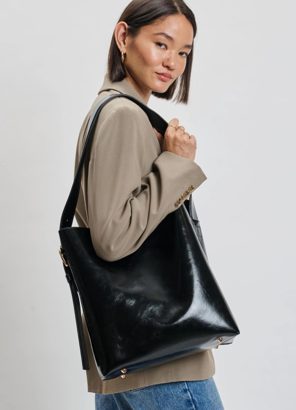 The Brooke Bucket Bag is a polished essential with room for everything you need. Its structured yet slouchy silhouette is crafted from glossy faux leather and accented with subtle gold-tone hardware for a sophisticated touch. Designed with a spacious interior, it’s perfect for carrying daily must-haves while still keeping your look sleek and elevated.