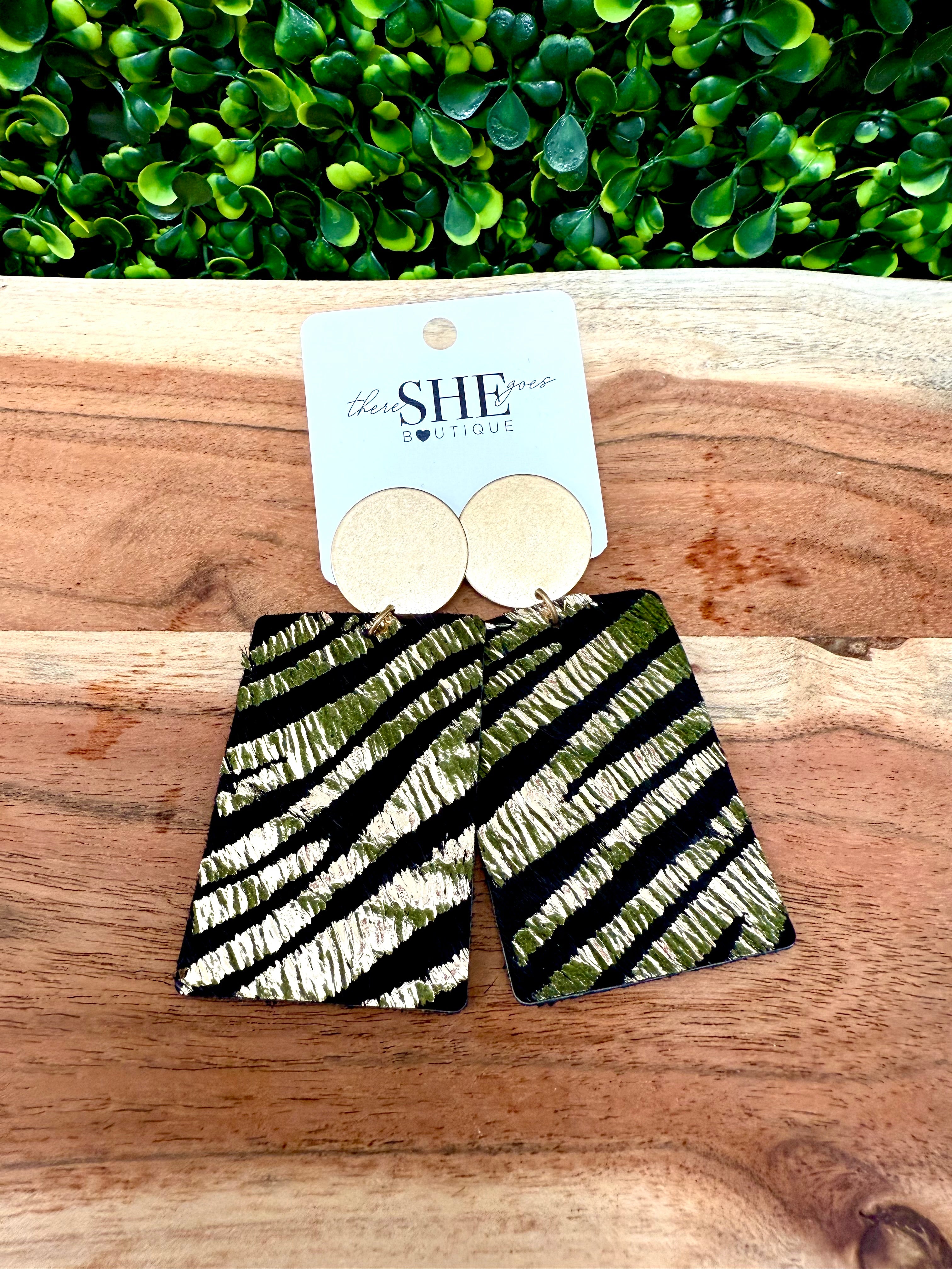 Unleash your inner glamazon with the Call of the Wild Earring. Measuring 2 3/4" long, these statement-makers feature a bold black and ivory zebra print on a textured rectangular drop, anchored by a sleek brushed gold disc. The mixed-media moment gives just the right amount of edge with an artsy, untamed twist.