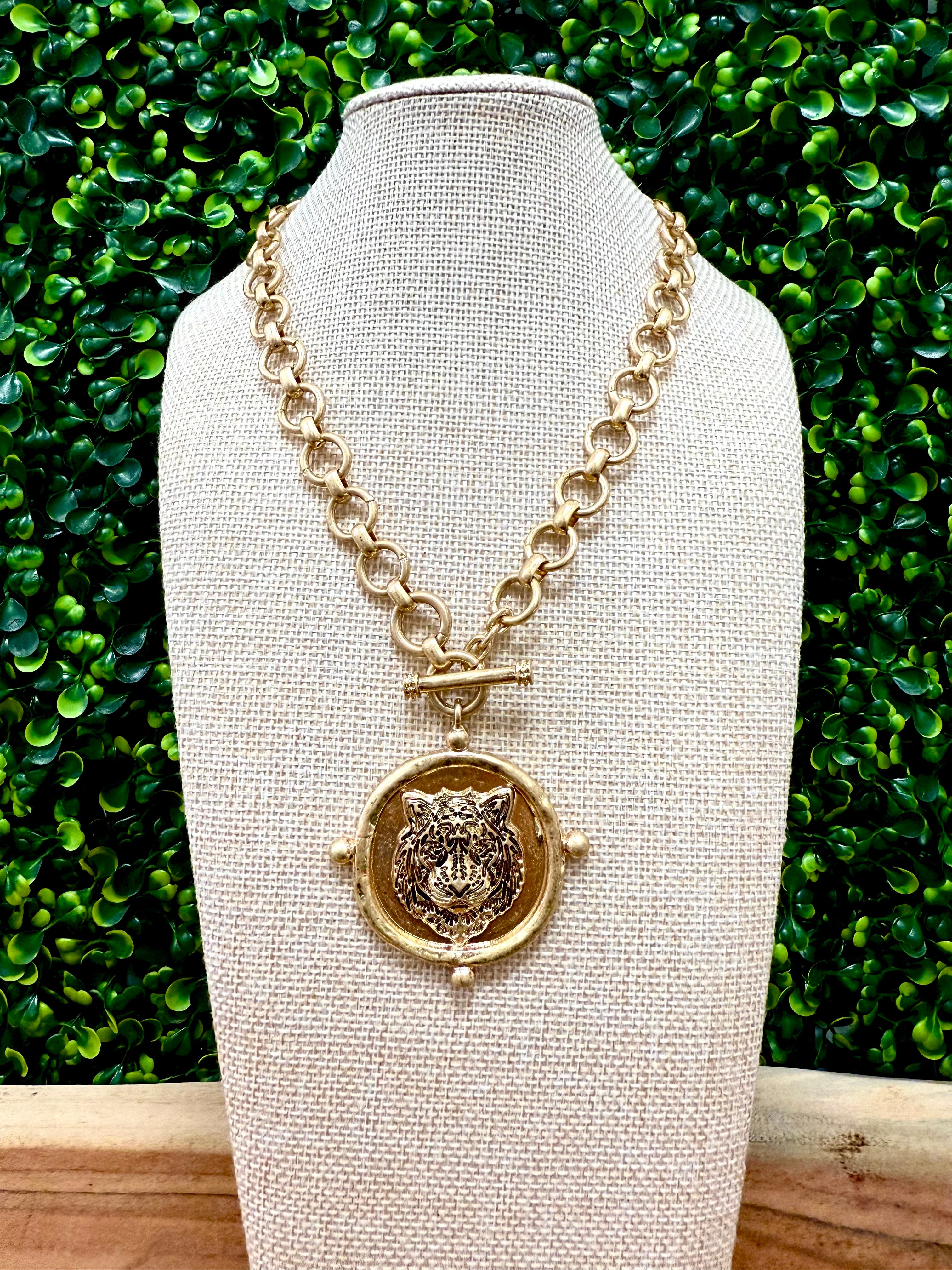 Bold and untamed, the Call of the Wild Necklace features a powerful tiger medallion suspended from a chunky 16" gold-tone chain with a front toggle clasp. It’s the ultimate statement piece for showing off your fierce side—on game day or any day you feel unstoppable.