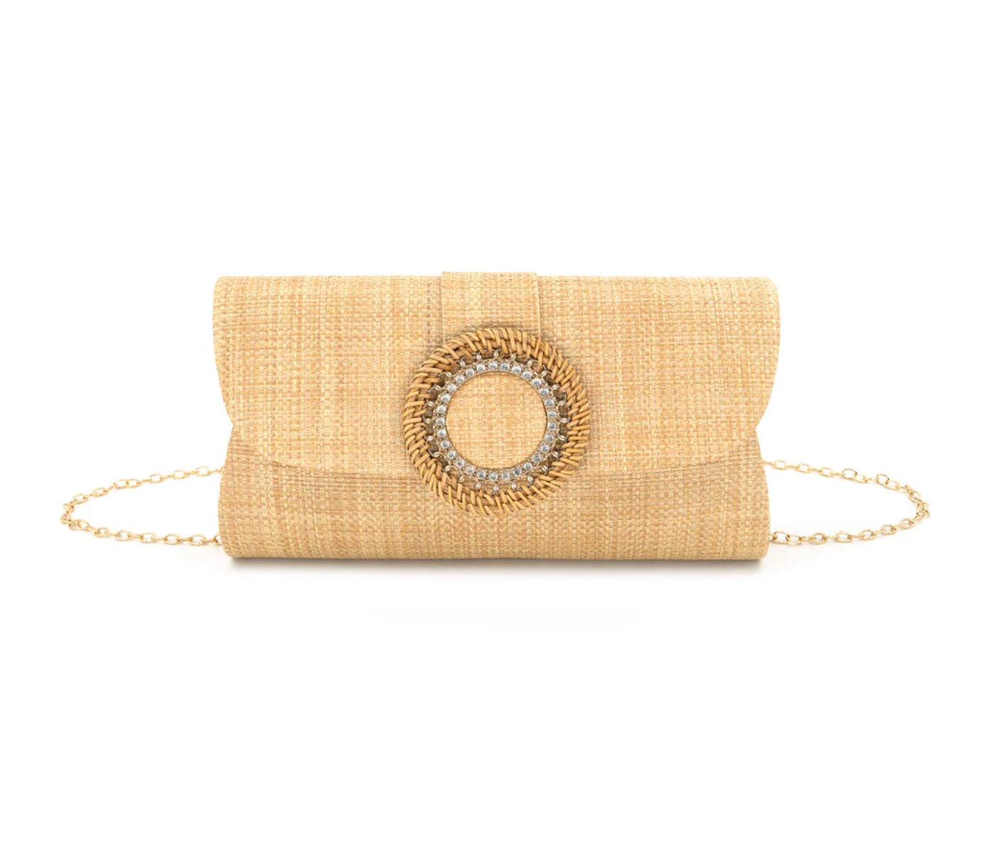 Chic, timeless, and effortlessly elevated, the Capri Clutch is your go-to accessory for warm-weather events and special occasions. Crafted from woven straw with a refined circular accent detail, this clutch brings a touch of coastal elegance to any look. The structured silhouette keeps it polished, while the delicate chain strap lets you wear it hands-free when needed.