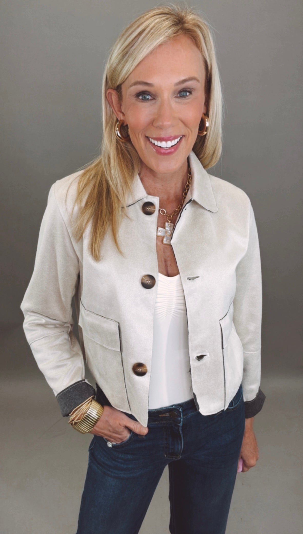 The Carlisle Jacket is the definition of understated sophistication. Designed with clean lines, oversized front pockets, and a modern cropped silhouette, it blends structure with ease. The soft, mid-weight fabric offers just the right amount of warmth, making it a perfect layering piece for transitional weather. Thoughtful details like tortoise buttons and subtle seam work give it a timeless, elevated feel you’ll reach for season after season.