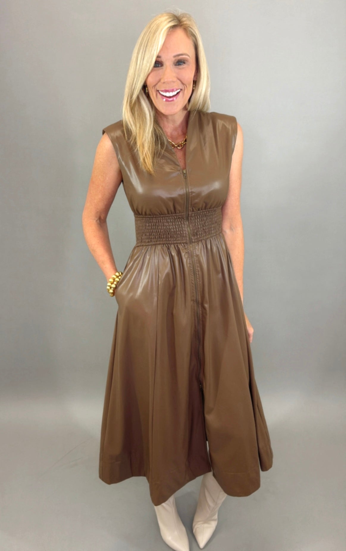 The City Circuit Midi is your shortcut to sleek sophistication. Crafted from a buttery-soft faux leather, this sleeveless stunner features a zip-up front, flattering smocked waist, and a flared midi skirt with side pockets (yes, really). It’s edgy yet elevated—ideal for the girl who means business but never blends in.