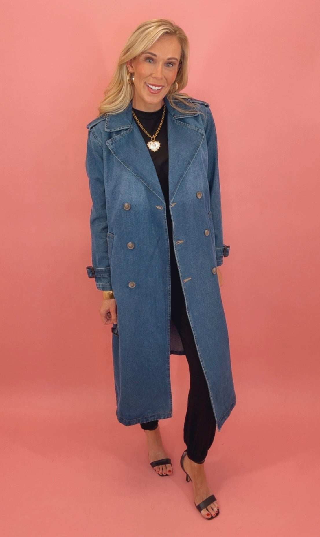 The City Limits Trench puts a modern twist on a timeless silhouette. Crafted from rich, medium-wash denim, this longline trench coat features classic details like notched lapels, belted cuffs, and side pockets — all with a relaxed, street-chic edge. It’s the perfect outer layer to elevate everything from office looks to weekend fits.