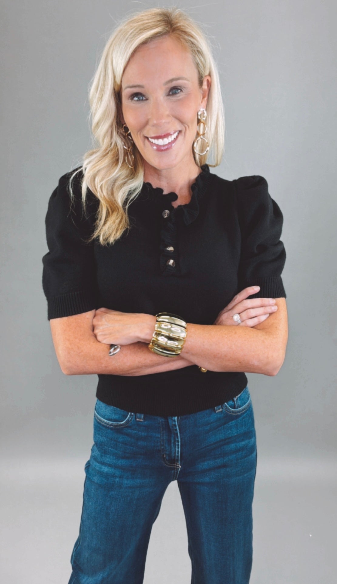 Timeless with a twist, the Classic Charm Sweater brings polish to your everyday look. Designed with soft puff sleeves, a ruffle-trimmed neckline, and a gold-button placket, it’s the kind of piece that feels both feminine and elevated. The knit fabric keeps it comfy, while the tailored details make it an easy go-to for work, brunch, or date night.