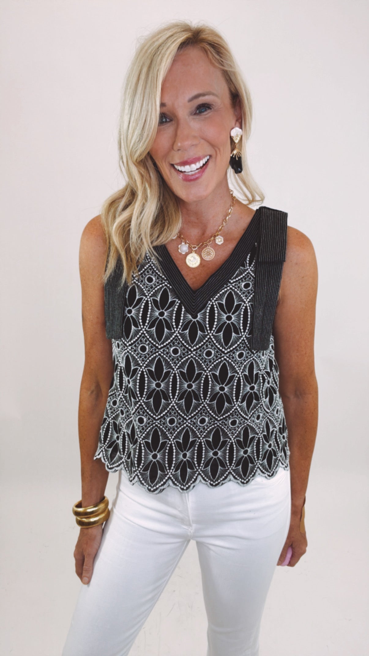 Vintage charm with a modern twist — the Deco Bloom Top is embroidered perfection. Featuring bold floral eyelet lace, contrast pinstripe details, and a scalloped hem, this sleeveless stunner is made to turn heads. The subtle V-neckline and bow-accented shoulders add just the right amount of polish for day-to-night versatility.