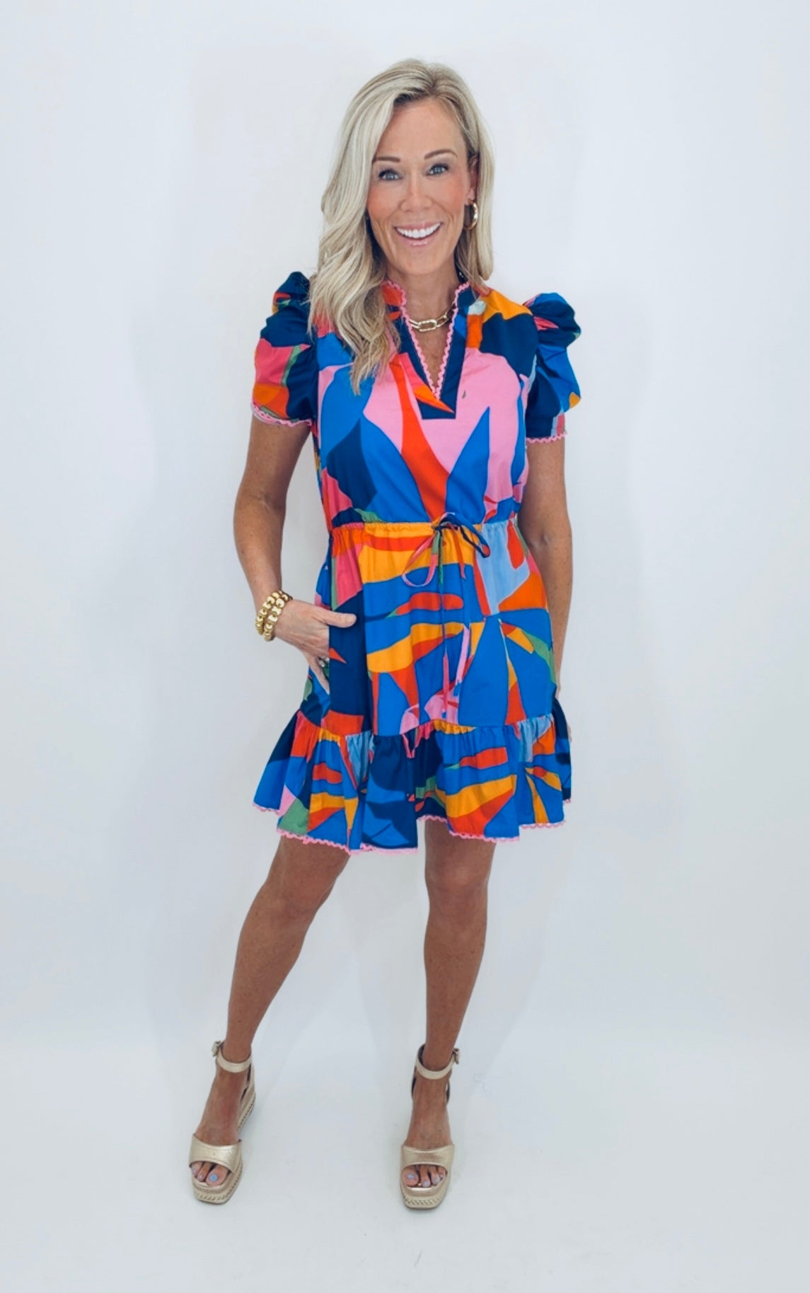 Pure joy in dress form. The Color Me Happy Dress is a bold, playful statement piece featuring a vibrant abstract print that instantly brightens your mood (and your outfit). Designed with flattering puff sleeves, a notched neckline with delicate trim detail, and an adjustable drawstring waist, it cinches you in while keeping things easy and comfortable. The flirty ruffle hem adds the perfect finishing touch—fun, feminine, and made to move.