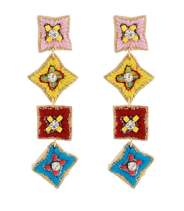 Say hello to your new mood-lifting must-haves! The Color Pop Earrings are 3" long and stacked with embroidered geometric tiles in vibrant shades of pink, yellow, red, and blue—each one topped with a little sparkle for extra flair. Bold, bright, and made to turn heads, these lightweight beauties bring the energy wherever they go.