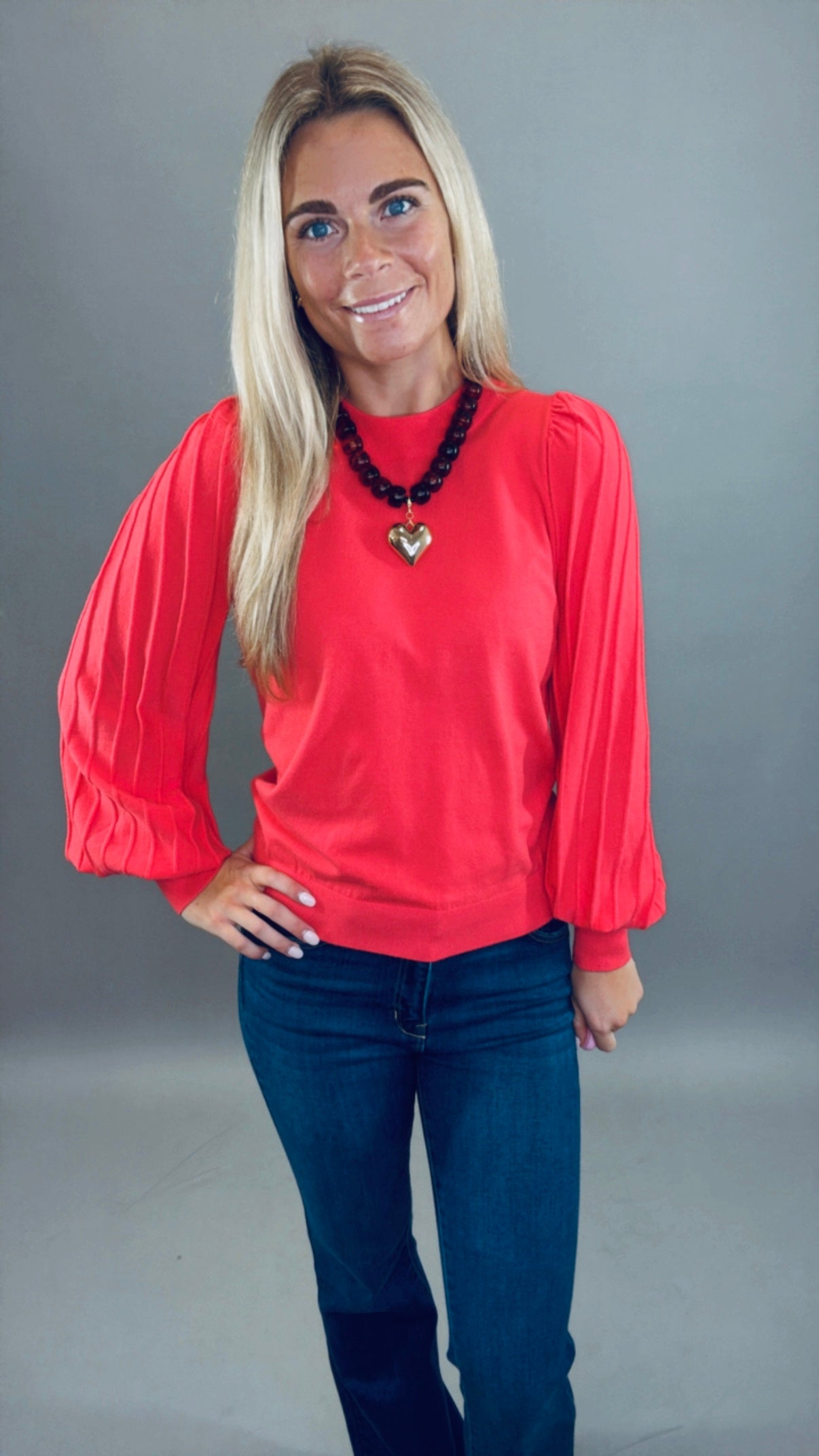 Turn heads in the Crush Season Sweater — a vibrant scarlet red knit designed to make an entrance. Featuring beautifully pleated balloon sleeves, a flattering straight fit, and a soft, mid-weight feel, this sweater adds just the right dose of drama to your everyday lineup. Romantic yet bold, it’s the statement piece your wardrobe’s been waiting for.