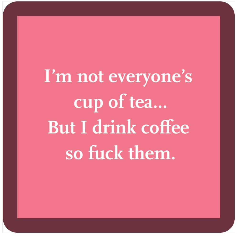 REUSABLE Coasters are 4”x 4” resin with cork backing and round corners. Sold individually.  BUY 4 or more of the same or assorted coasters & they come with a cute rubber band!  AMAZING hostess gift or funny gift for any & every day!!! Made in the USA.