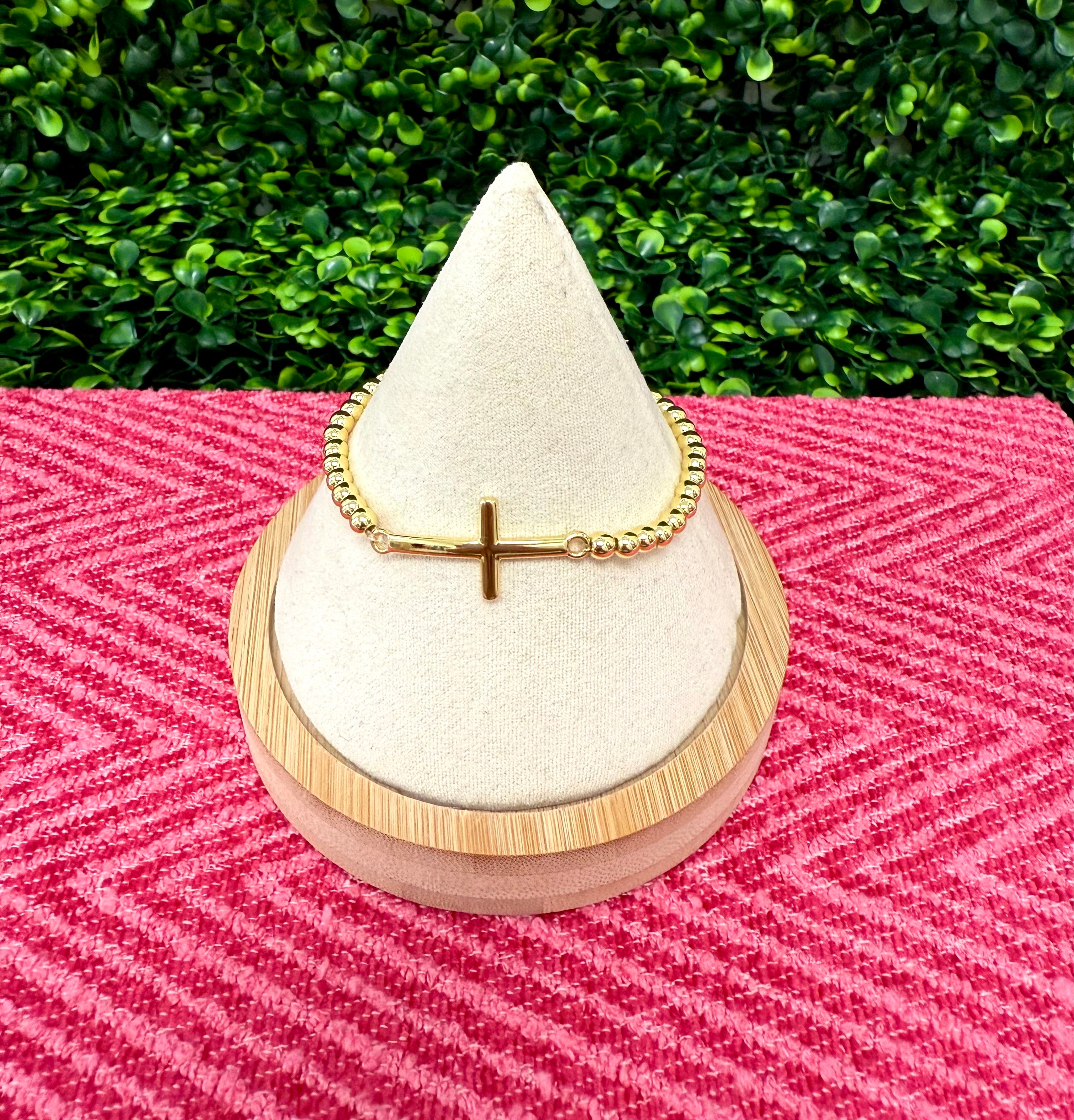 A subtle nod to faith and fashion—this curved cross bracelet is strung with sleek gold beads for a clean, polished finish. Crafted from stainless steel, gold dipped, and water resistant, it’s your everyday reminder that chic and spiritual can coexist.