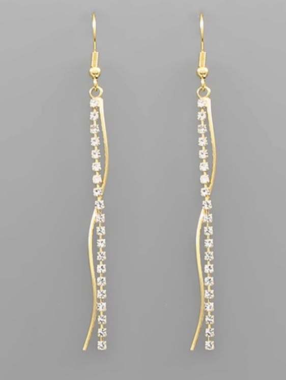 The Dazzle Line Earrings bring sleek sophistication with a hint of sparkle. These 3" gold-dipped drop earrings feature a delicate wavy bar paired with a shimmering line of crystals — perfectly balancing modern minimalism and glam. Lightweight and elegant, they’ll instantly elevate any outfit from day to night.