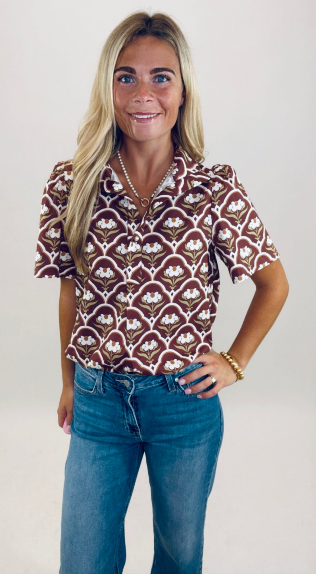 Channeling vintage charm with a modern twist, the Deco Blossom Top is a statement piece for your wardrobe. Designed in a retro-inspired floral print, it features a crisp collared neckline, short sleeves with a subtle puff, and a relaxed silhouette for effortless wear. The structured yet soft fabric gives it that perfect blend of polished and playful, making it an easy go-to for work, brunch, or a weekend outing.