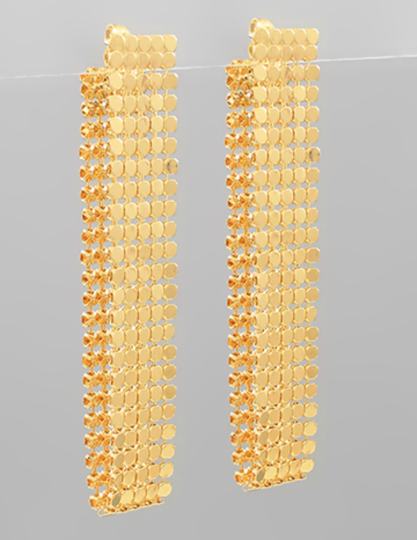 Shine bright and steal the spotlight with our Disco Drape Earrings. Featuring cascading rows of gold-tone mesh, these statement-makers move with every step and shimmer under the light. Bold yet versatile, they’re the ultimate finishing touch for nights out, special occasions, or anytime you’re craving a little extra glam. Length: 3".