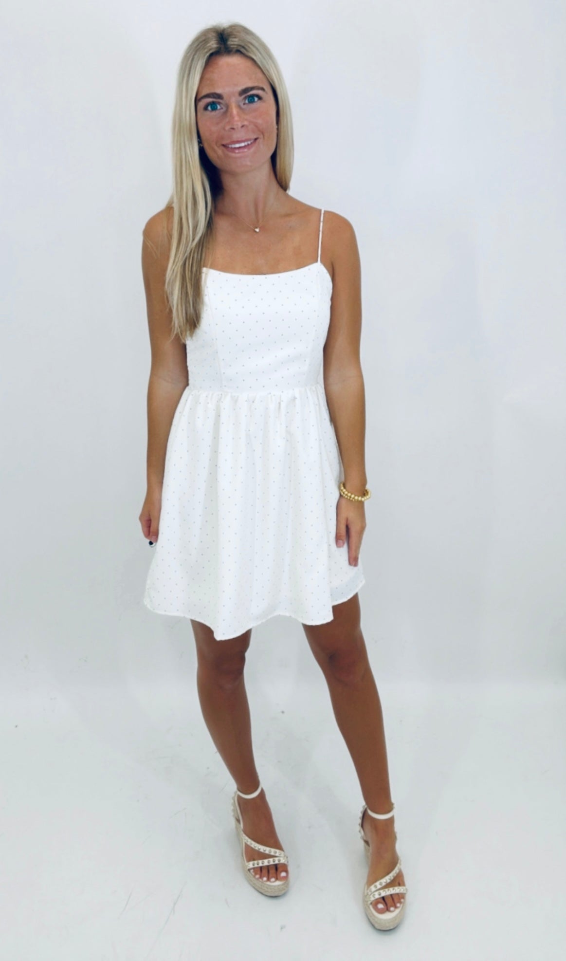The Dot Dot Darling Dress brings flirty charm in the sweetest way. Featuring a soft cream backdrop with perfectly placed brown micro-dots, this mini is equal parts playful and timeless. Designed with dainty spaghetti straps, a square neckline, and a softly gathered waist, it’s the kind of piece that makes “effortless” look easy.