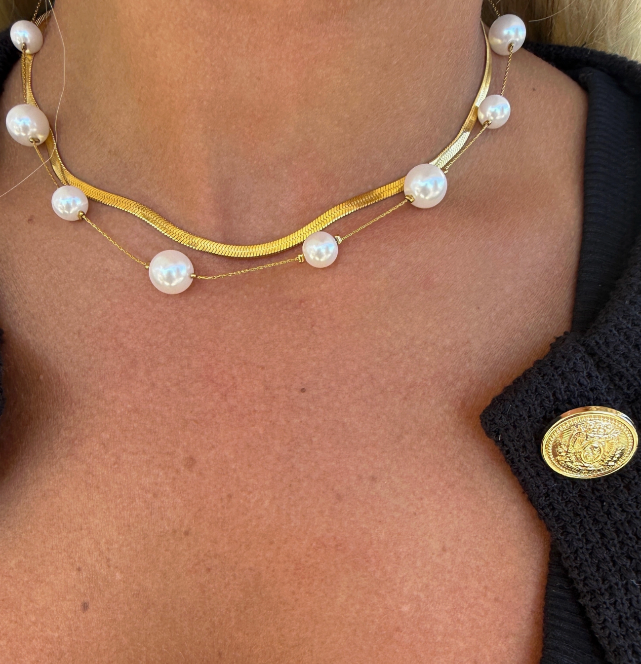 Wear both layers for an elevated everyday look, or try the pearl strand solo with a simple black top for a subtle pop. The gold herringbone chain shines on its own too — perfect for stacking with your other TSG favorites.