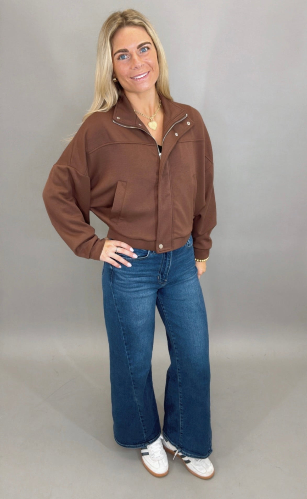 Effortlessly cool and city-chic, the Downtown Drift Jacket brings a modern edge to your everyday wardrobe. Made from a smooth, subtly structured scuba-style knit, this cropped jacket features clean lines, a sleek snap-front closure, and a high stand collar that adds instant polish. Lightweight, minimal, and versatile, it’s the perfect blend of sporty and sophisticated — great for errands, travel, or elevating your casual looks. Style Tip: Pair it with joggers for a sleek athleisure set, or dress it up with high-rise denim and a fitted tee. Pop the collar for extra attitude, and finish with gold hoops or layered necklaces for that signature TSG touch. Also perfect layered over activewear on on-the-go days. Sizing Tips: Runs true to size with a boxy, slightly cropped silhouette. Size up if you prefer a more relaxed or oversized fit. The fabric has light stretch and a smooth, structured feel that holds its shape beautifully.