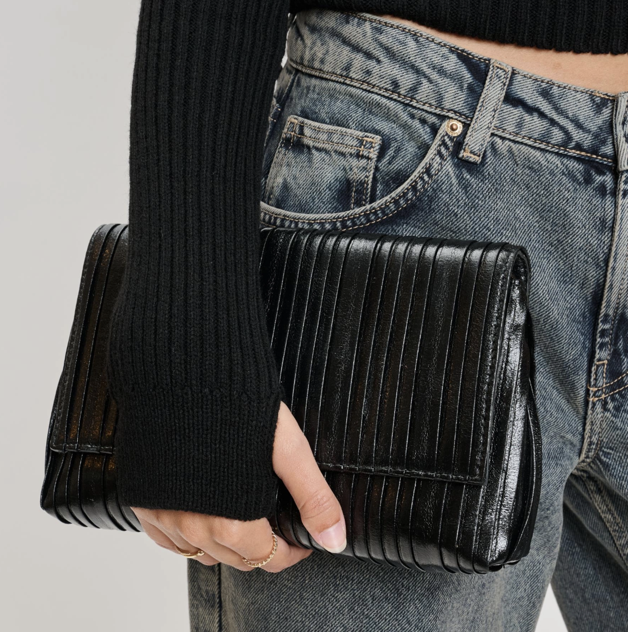 The Esmeralda Clutch is your go-to statement piece, designed with sleek vertical pleating that adds just the right amount of texture and shine. Available in glossy black and metallic gold, it’s the perfect mix of timeless and modern. Its structured fold-over silhouette gives it that chic edge, while the gold chain strap lets you carry it as a shoulder or crossbody bag for hands-free convenience. Compact yet roomy enough for your night-out must-haves, this clutch is all about polished versatility.