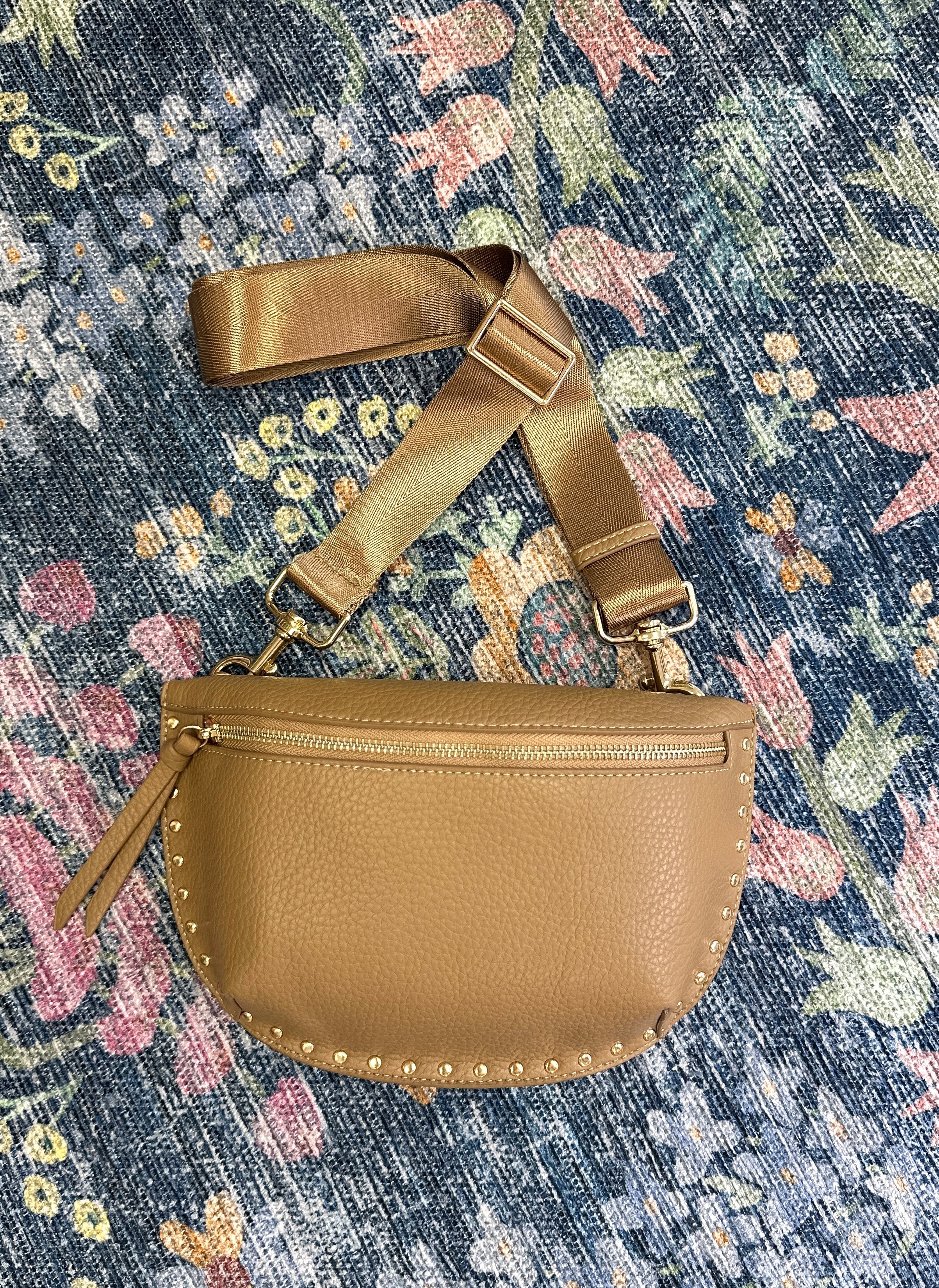 This sleek and structured fanny bag adds just the right amount of attitude to your everyday look. Designed with gold stud detailing and a smooth faux leather finish, it’s equal parts edgy and versatile. The adjustable strap allows for comfortable wear around the waist or across the chest, making it perfect for errands, travel, or on-the-go style. Measures 10.5 x 6.5 x 2.5 inches.