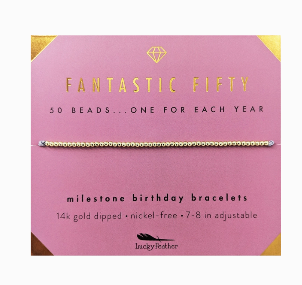 Celebrate life’s milestones in style. These delicate bracelets feature a dainty cord and 14k gold-dipped beads—one for each remarkable year. This dainty bracelet is the perfect way to celebrate any 50 year-old’s birthday. There are 50 beads, one for each remarkable year of life! They’re a meaningful keepsake shoppers will love gifting.