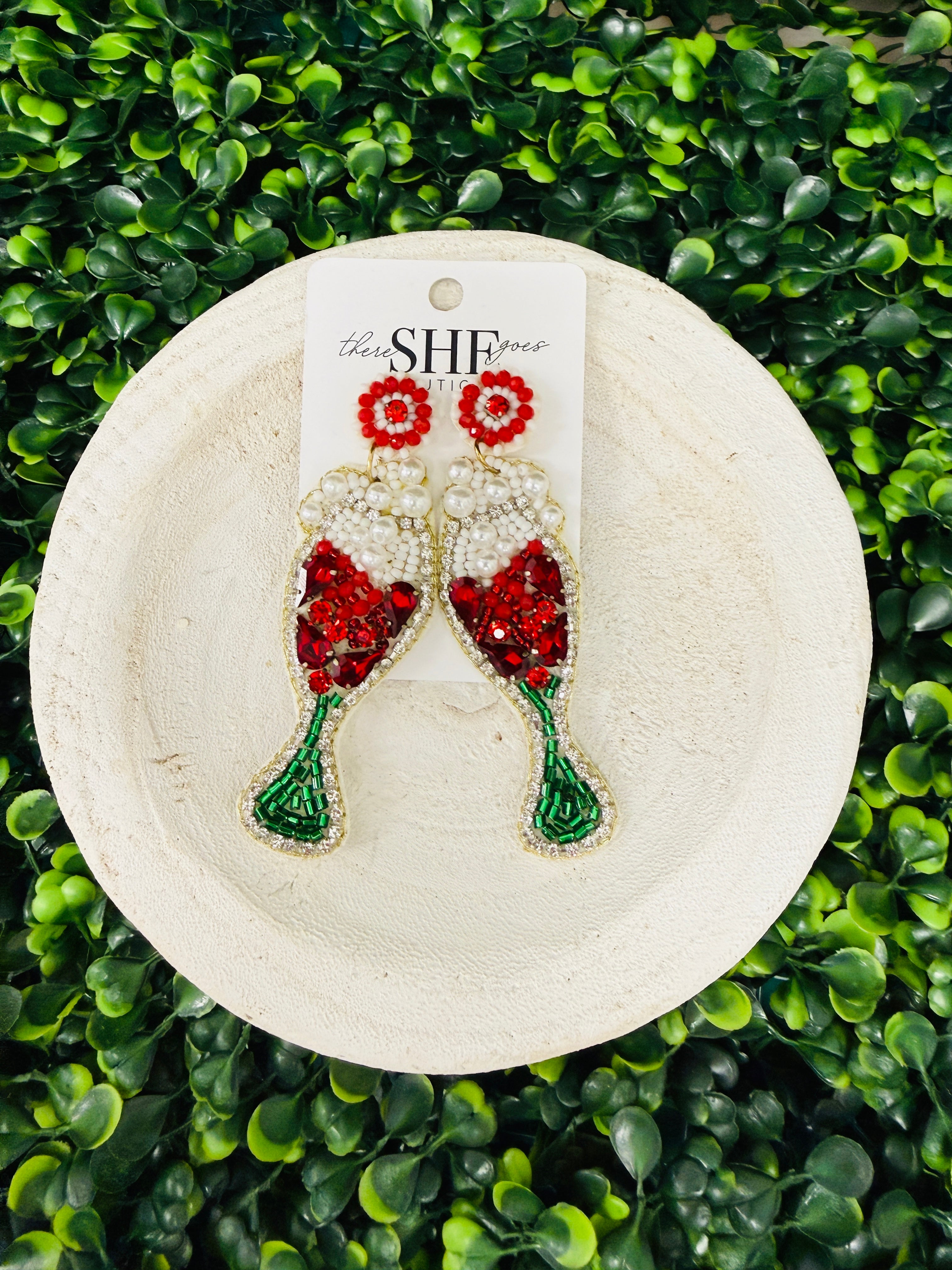 Raise a little holiday cheer with these playful 3" Festive Bubbly Bead Earrings. Designed to resemble a sparkling seasonal sip, each earring features red crystal “bubbles,” pearl accents, and a green beaded stem, all framed in shimmering rhinestones. Full of color, charm, and irresistible sparkle, they’re the perfect statement piece for parties, celebrations, and every merry moment of the season.