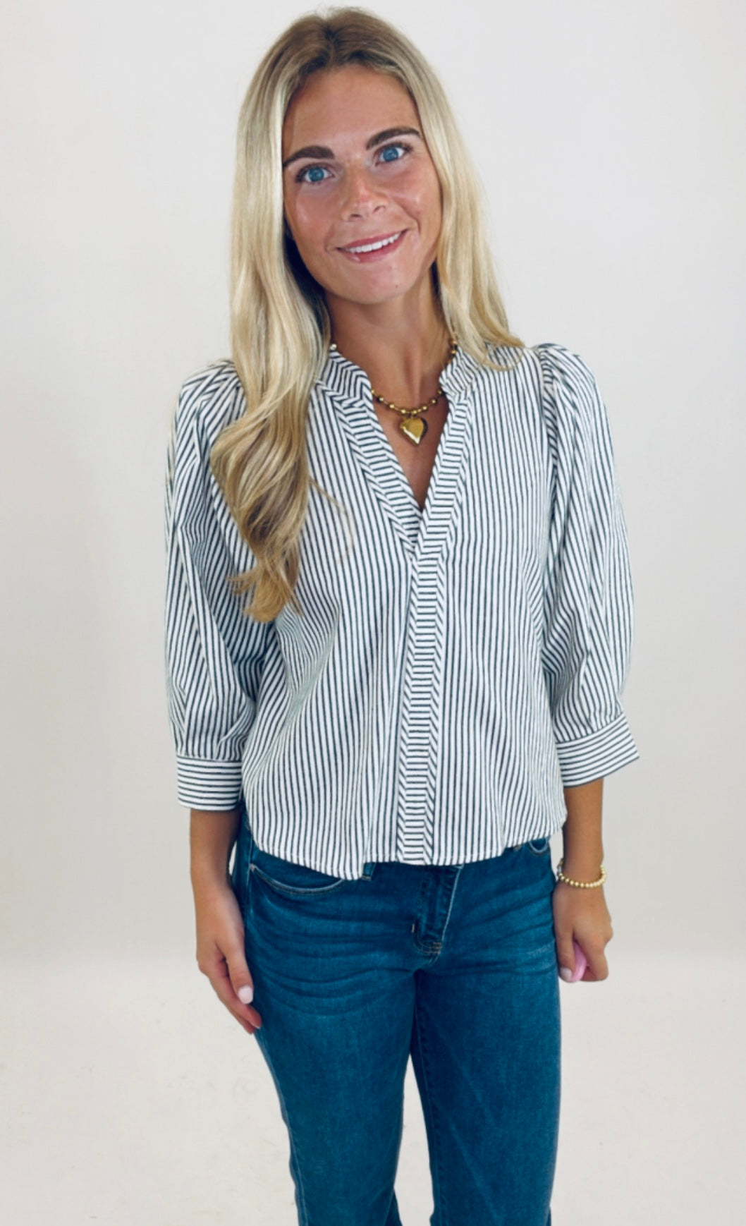 Tailored yet relaxed, this striped blouse features a flattering V-neckline, subtle pleating, and slightly puffed 3/4 sleeves for a modern twist on a classic shirt. The mixed-direction stripes give it that extra style edge.