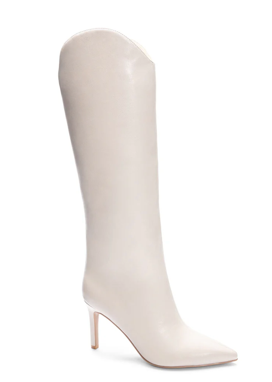 Made to be worn out on the town. A western-inspired boot with a modern, minimalist twist, the knee-high Fiora Dress Boot in cream or black vegan leather is in a league all its own. From its pointed toe, and tapered stiletto heel, to its curved collar, its sleek yet sultry design makes it the perfect going-out shoe.