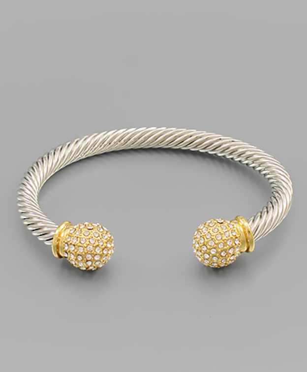 Bold and brilliant, the Fireball Cable Cuff is a show-stopping piece that fuses modern design with dazzling detail. The twisted silver-tone cable band creates a sleek foundation, while each end is capped with a golden, pavé crystal “fireball” that catches the light from every angle. Open-ended for an easy slip-on fit, this cuff is equal parts edgy and elegant, making it a versatile statement piece for any jewelry lover.