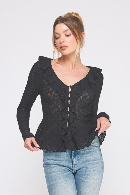 Turn heads in the Flair for Drama Top — a sultry lace statement piece that’s equal parts feminine and fierce. Featuring cascading front ruffles, delicate loop button closures, and a subtly flared peplum hem, this top delivers the perfect dose of romantic flair. The sheer lace adds a touch of intrigue, making it a standout choice for date nights or dressy occasions.