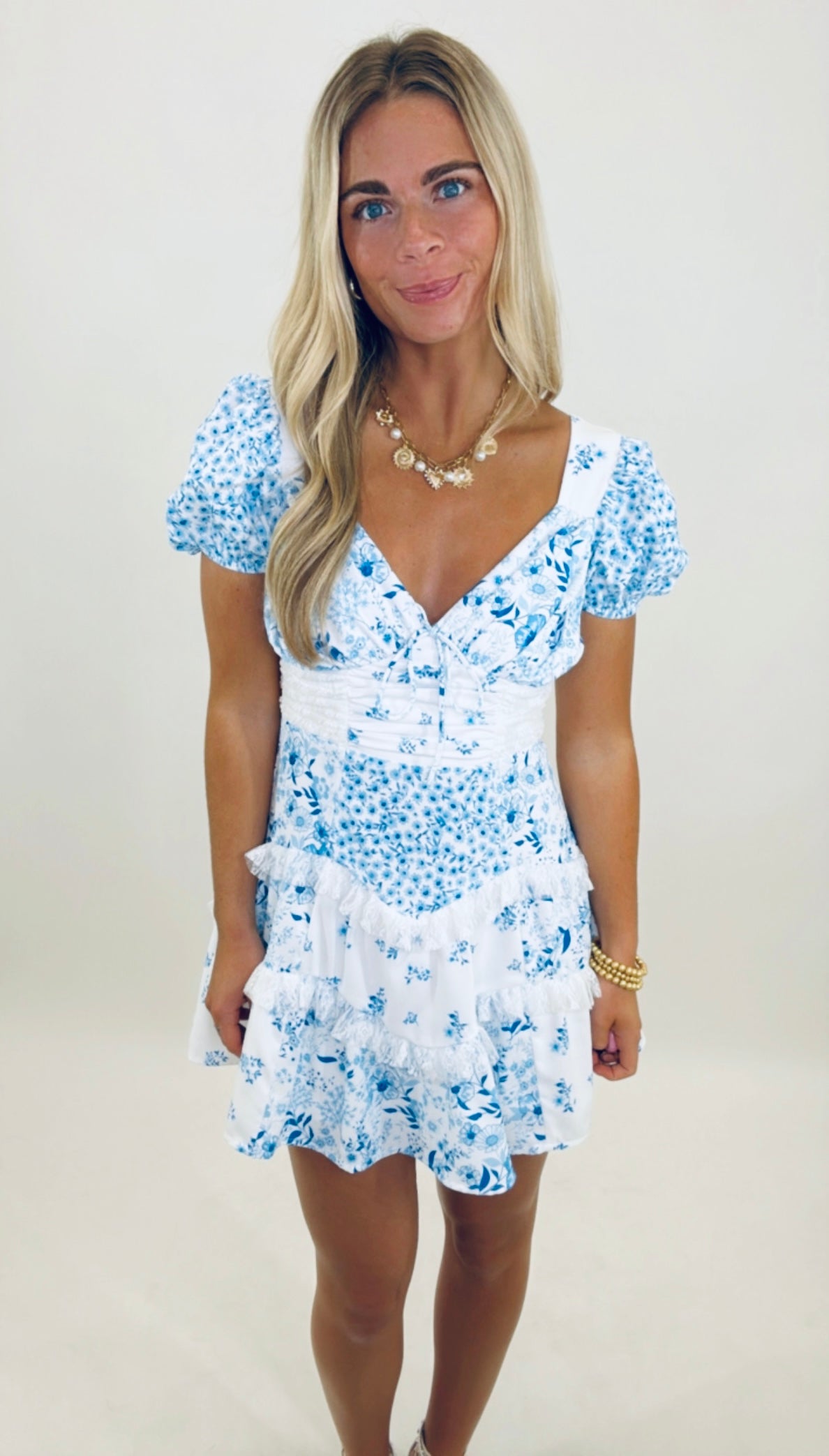 Major heart-eyes for the Flirt Alert Mini! This blue-and-white floral patchwork dress brings all the girly vibes with puff sleeves, a sweetheart neckline, and the cutest tie-front detail. The smocked back keeps it comfy, while the tiered skirt is ready for twirls, pics, and whatever summer throws your way. It's giving soft, flirty, and effortlessly cool.