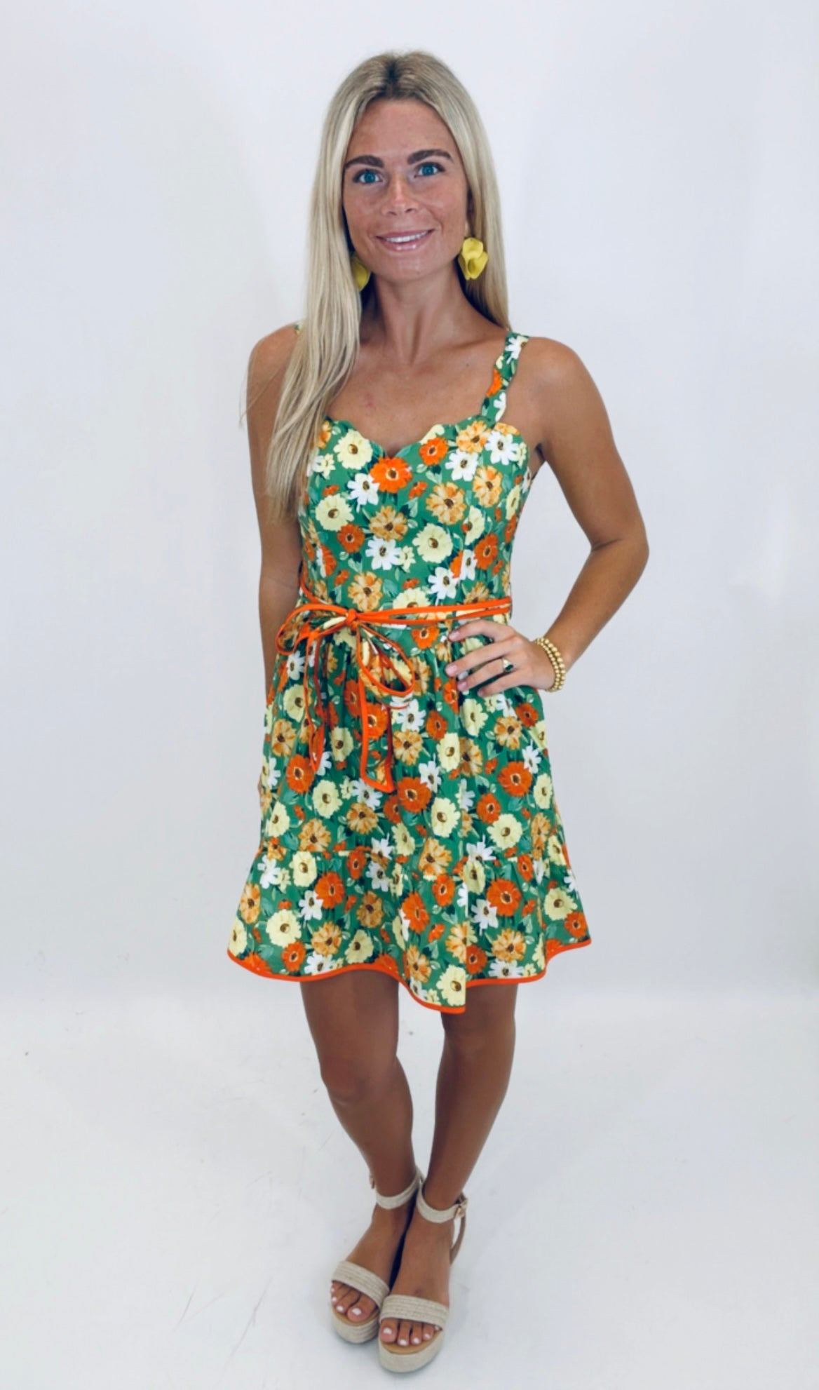 Bright, playful, and bursting with bloom—the Fresh Picked Mini is your go-to for sunny days and feel-good fits. Featuring a scalloped neckline, bold floral print, tiered skirt, and a contrasting tie belt, this dress is serving fresh from the garden energy with a side of flirty charm. Every detail feels extra—without trying too hard.