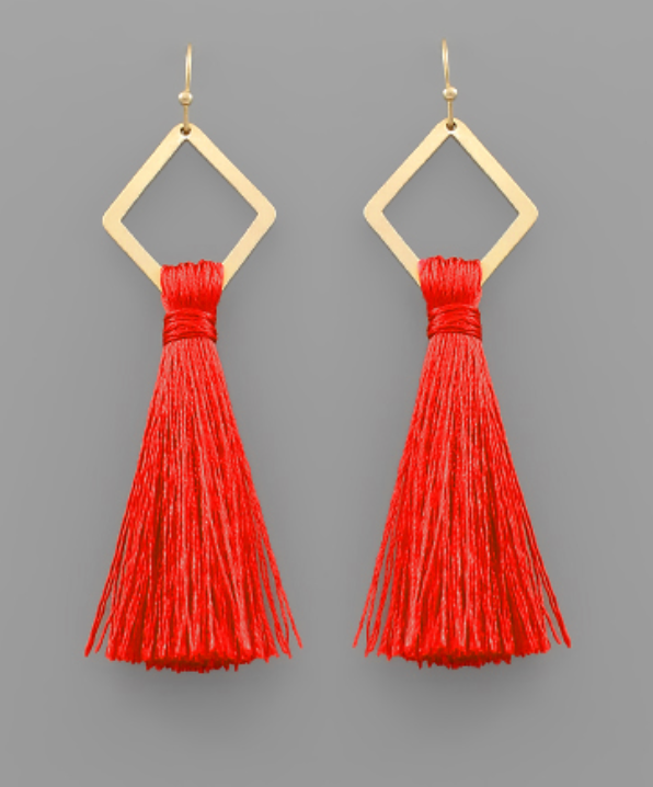 Make a statement with every step in the Fringe Finale Earrings—featuring bold red tassels that sway with sass and shine. A geometric gold-tone diamond frame anchors the 3-inch silky fringe for a look that's both modern and playful. Lightweight but full of impact, these earrings bring the drama without the drag.