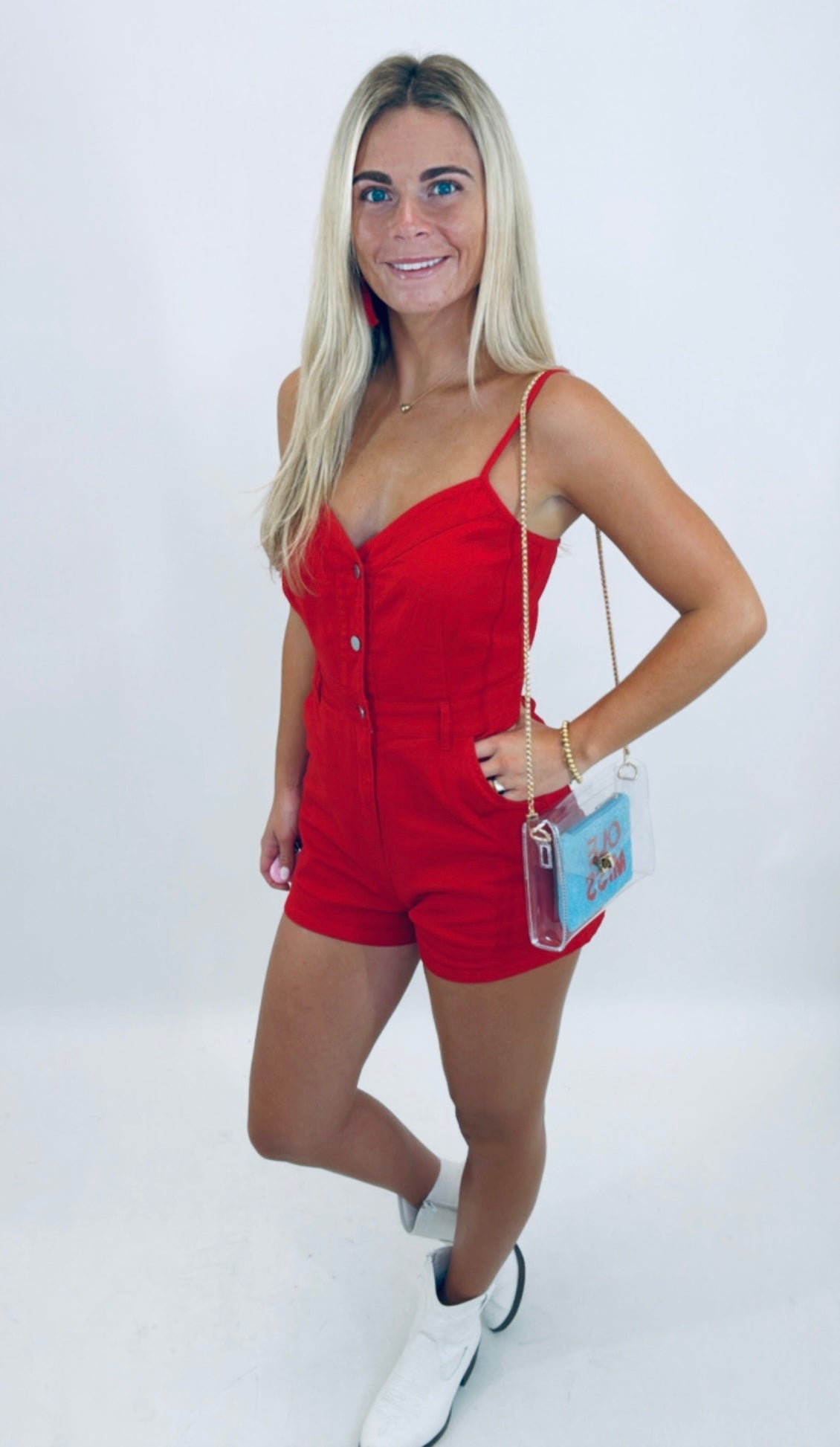 Bring the heat to the tailgate in the Game Day Glam Romper. This firecracker red one-piece is made for cheering, dancing, and celebrating every touchdown in style. With its sweetheart neckline, button-front detail, and flattering fitted bodice, it’s flirty and functional. Relaxed shorts and handy pockets make it perfect for all-day comfort while still serving that “main character” energy.