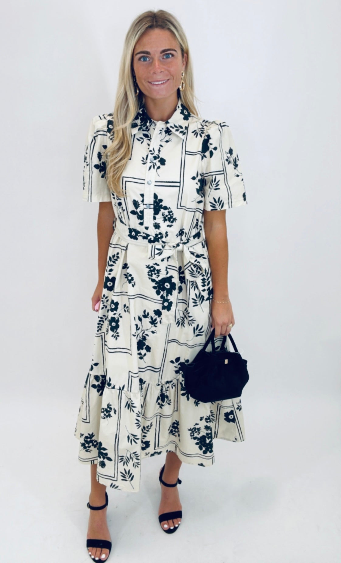 Step into effortless elegance with the Garden Dream Dress, a shirt-dress silhouette that’s as timeless as it is romantic. Designed with a cream backdrop and bold black floral print, it features a collared neckline, button-front detail, and a self-tie waist that flatters every figure. The tiered skirt adds a breezy touch, making it the perfect blend of structure and flow. Equal parts polished and dreamy, this midi is ready for anything from brunch to date night.