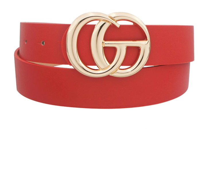 Add a polished finishing touch to any look with the GG Buckle Belt. Designed with a sleek faux leather strap and accented by a bold, interlocking double-ring gold buckle, this belt blends timeless style with everyday versatility. Its adjustable fit and classic design make it the perfect piece to cinch a dress, elevate denim, or polish off trousers.