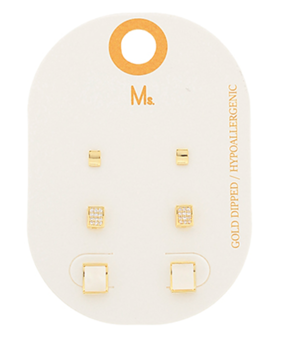 A trio of tiny-but-mighty studs that pack major style. This set includes three minimalist square designs—sleek gold bars, sparkly pavé squares, and glossy ivory-look studs—all gold-dipped and hypoallergenic. Each pair ranges from 1/8" to 1/4" for easy layering or solo wear.