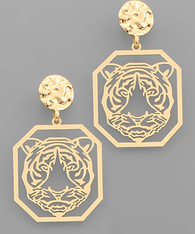 Bring the drama with the Golden Growl Earrings—featuring a fierce tiger face cutout framed in a bold octagon and anchored by a textured gold stud. Though they measure 2", they make a much bigger statement, perfect for Mizzou game days or everyday fierceness. Lightweight yet bold, these earrings roar without saying a word.