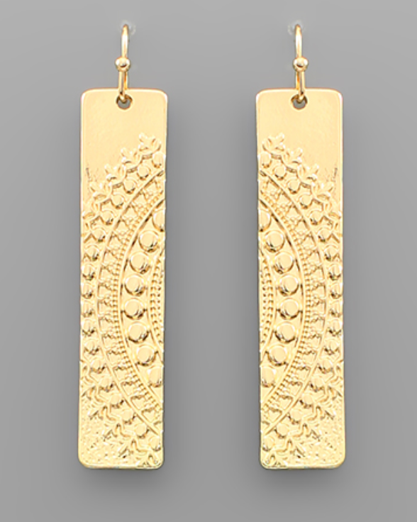 A bold yet elegant statement, the Golden Horizon Earrings feature a rectangular silhouette with intricate embossed detailing that catches the light beautifully. At 2 inches long, these earrings strike the perfect balance between sleek and standout, making them versatile for both day and night.