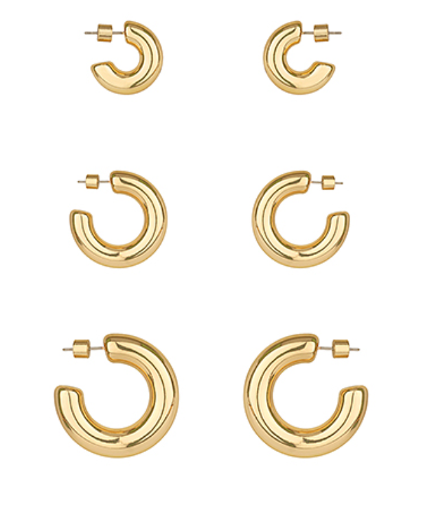 The Golden Trio Hoop Set brings versatility and shine to your collection. Ranging from 7/8" to 1 3/8" long, each pair of hoops features a sleek, rounded silhouette with a high-polish finish. From everyday minimal to bold statement, this set has you covered for every occasion.