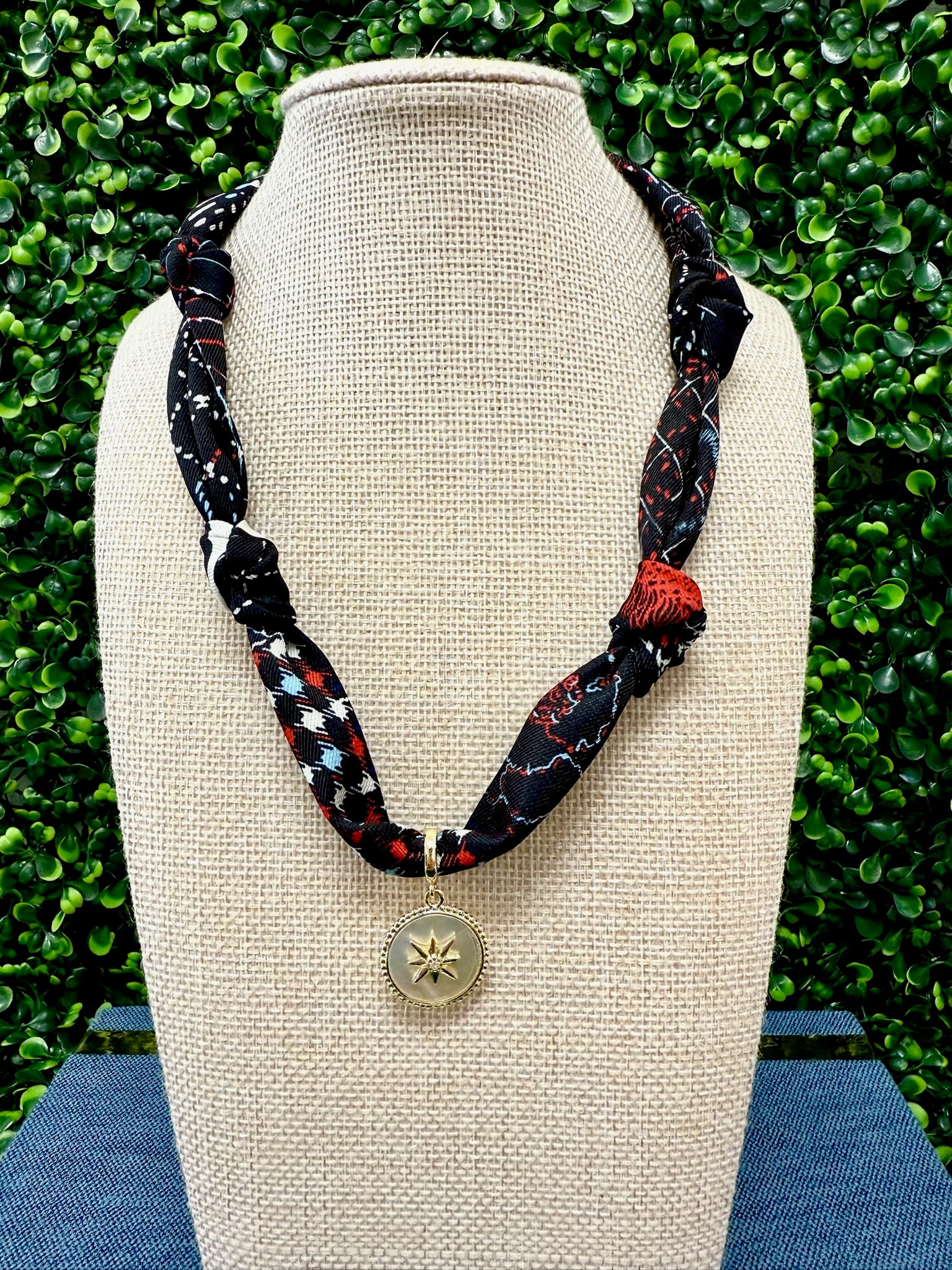 Find your fashion true north with the Guiding Star Scarf Necklace. A patterned scarf, rich with bold pops of red and black, is paired with a radiant starburst charm set against a luminous mother-of-pearl disc. The charm is removable, giving you the freedom to wear it on a chain, swap it with other charms, or enjoy the scarf solo for a chic accent. It’s the kind of piece that adds instant intrigue to any outfit.