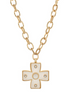 A timeless statement with a modern edge, the Heirloom Halo Cross Necklace features a bold enamel cross pendant accented with gleaming halo-style crystal insets. Suspended from a textured gold-dipped chain, this piece blends heirloom charm with everyday sophistication. Available in classic ivory or rich tortoise, it’s the perfect standout accessory for elevating sweaters, blouses, and dresses alike.
