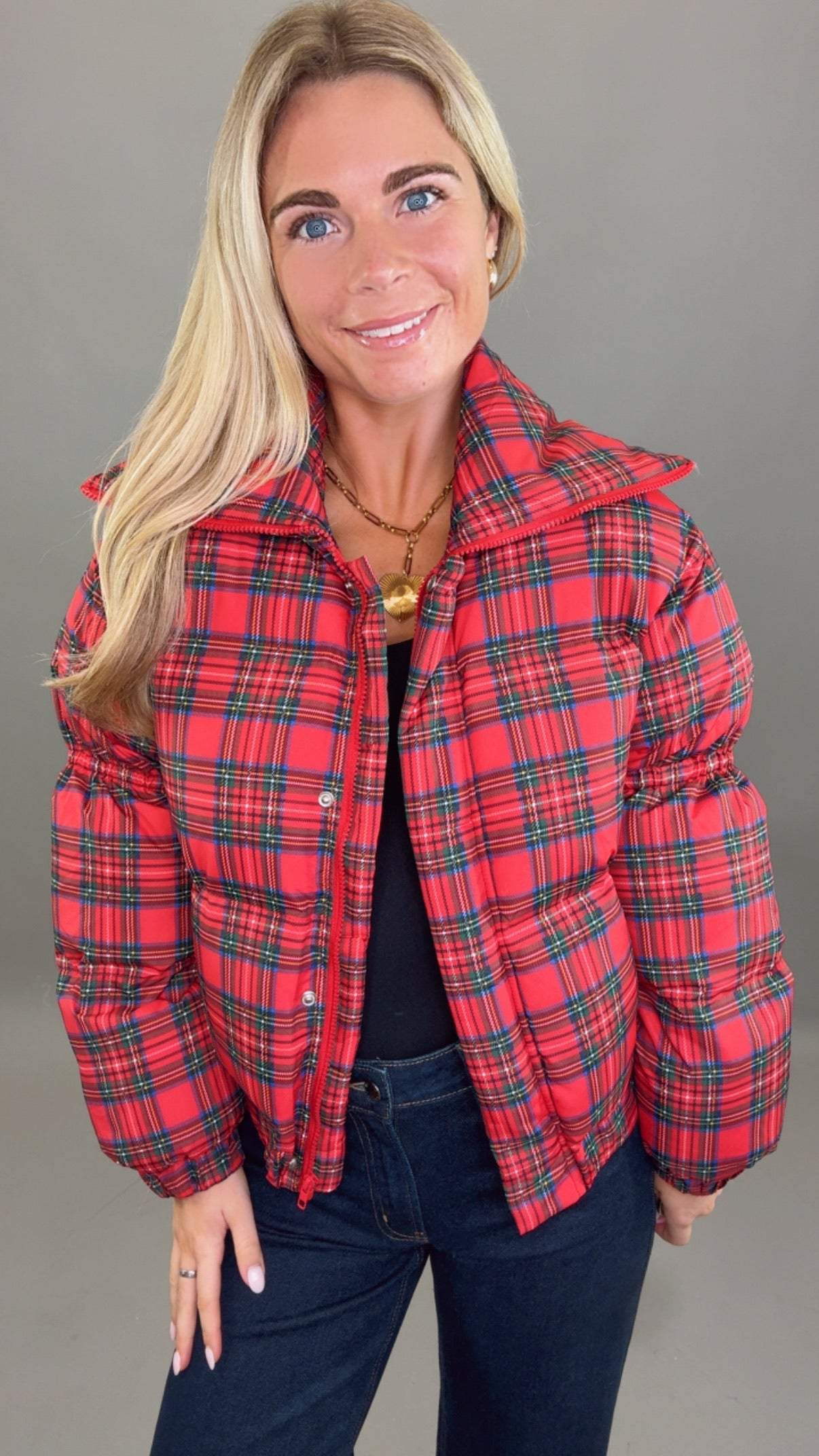A merry little puffer moment! This red plaid jacket brings equal parts warmth and holiday charm with its soft quilted feel, snap-button front, and easy, relaxed fit. Lightweight yet cozy, it’s the throw-on layer that instantly makes any outfit feel more festive.
