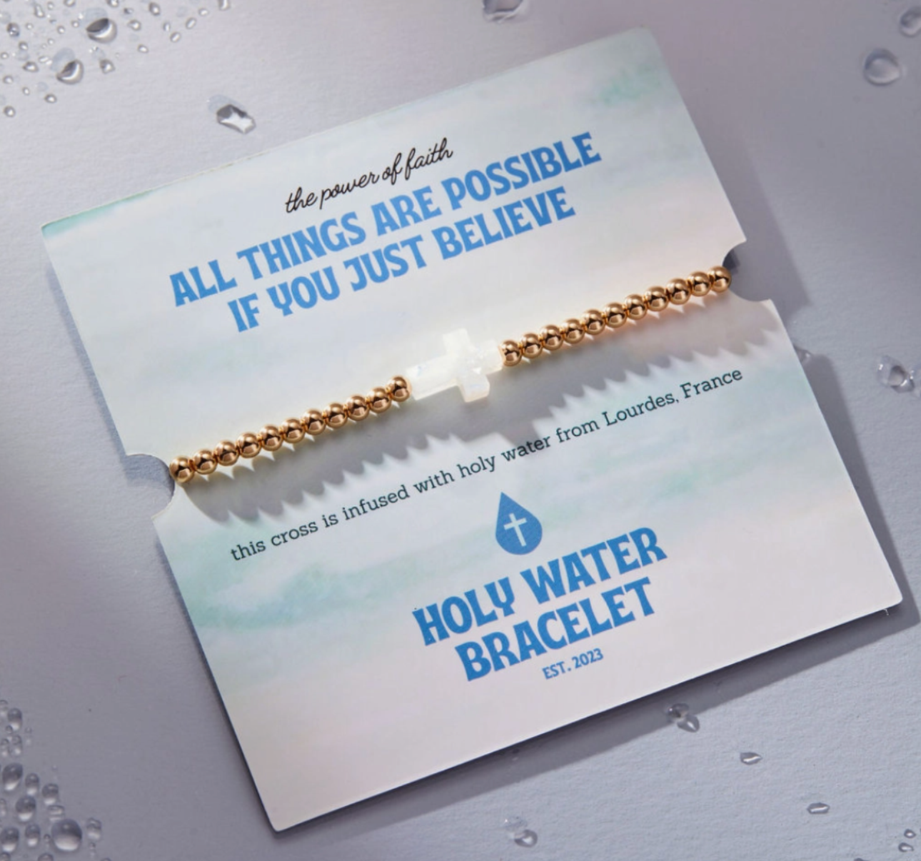 An everyday essential finished with bright gold plated beads and featuring our signature cross infused with authentic holy water sourced directly from Lourdes, France.